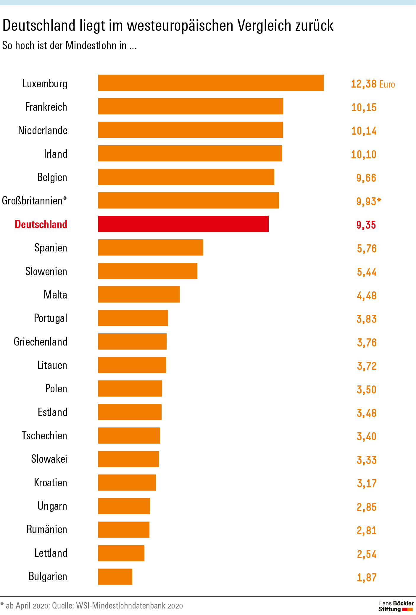 In den westeuropäischen Ländern mit Mindestlohn betragen die niedrigsten erlaubten Brutto-Stundenlöhne aktuell mit Ausnahme von Großbritannien und Deutschland mehr als 9,66 Euro. In Belgien, wo es in diesem Jahr noch keine Einigung über eine Erhöhung gab, müssen mindestens 9,66 Euro gezahlt werden, in Irland seit 1. Februar 10,10 Euro, in den Niederlanden seit Jahresbeginn 10,14 Euro und in Frankreich 10,15 Euro. Den mit Abstand höchsten Mindestlohn hat Luxemburg mit 12,38 Euro. Der Mindestlohn in Großbritannien ist mit umgerechnet aktuell 9,35 Euro so hoch wie in Deutschland, er wird zum 1. April aber auf 9,93 Euro erhöht. Zudem ist der Euro-Wert geprägt durch den Einbruch des Britischen Pfunds seit dem Brexit-Referendum. Würde man den aktuellen britischen Mindestlohn mit dem Durchschnittskurs der 2000er Jahre umrechnen, läge er bei 11,78 Euro.